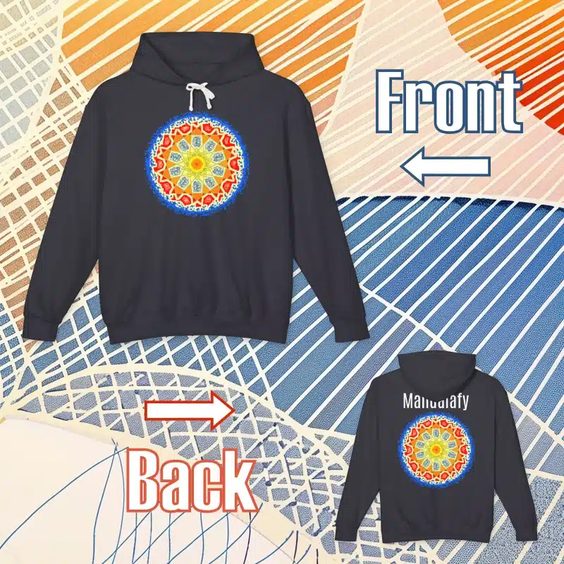 This Black Hoodie, decorated with the Sun & Scribble mandala is the perfect cozy companion for any season. The vibrant design appears prominently on both the front and back – showcasing the mandala in full glory on the front, with an equally stunning display on the back below subtle Mandalafy branding. Whether you’re treating yourself to wearable meditation or giving someone a gift that’s impossible to find anywhere else, this premium lightweight hoodie turns creativity into something you’ll love wearing year-round.