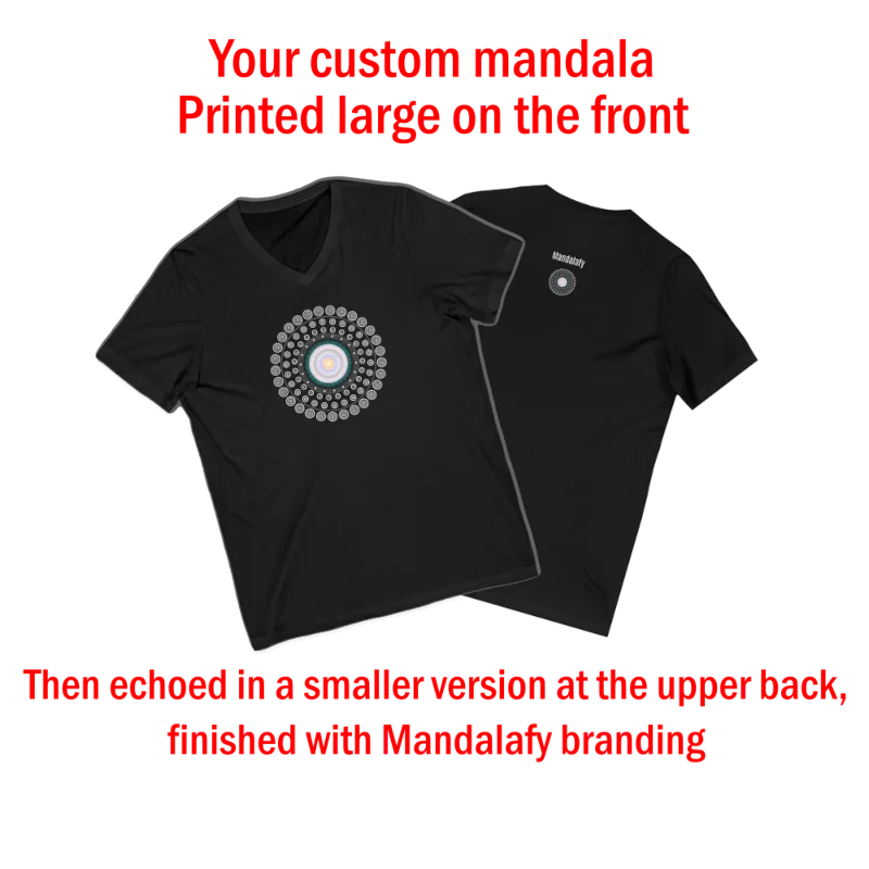 Transform your mandala creation into wearable art. Your unique design appears prominently on the front, with a complementary smaller version on the sleeve alongside subtle Mandalafy branding. Whether you’re treating yourself to mindful fashion or giving someone a gift that’s impossible to find anywhere else, this comfortable V-neck tee turns your creativity into something you’ll love wearing.